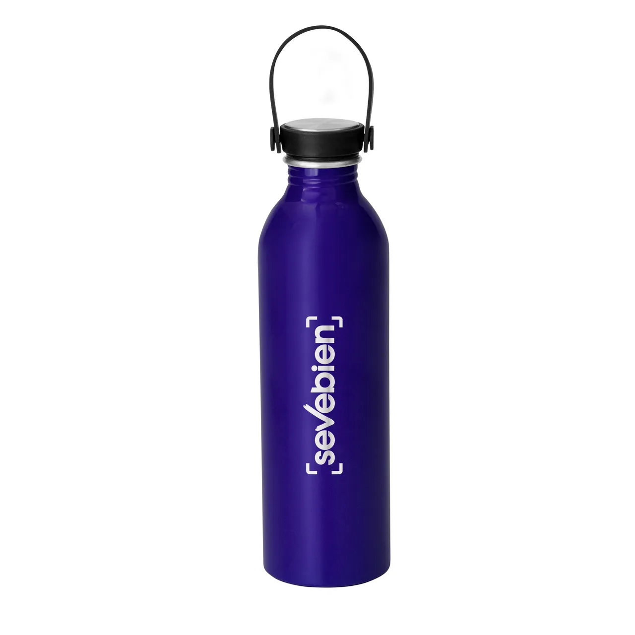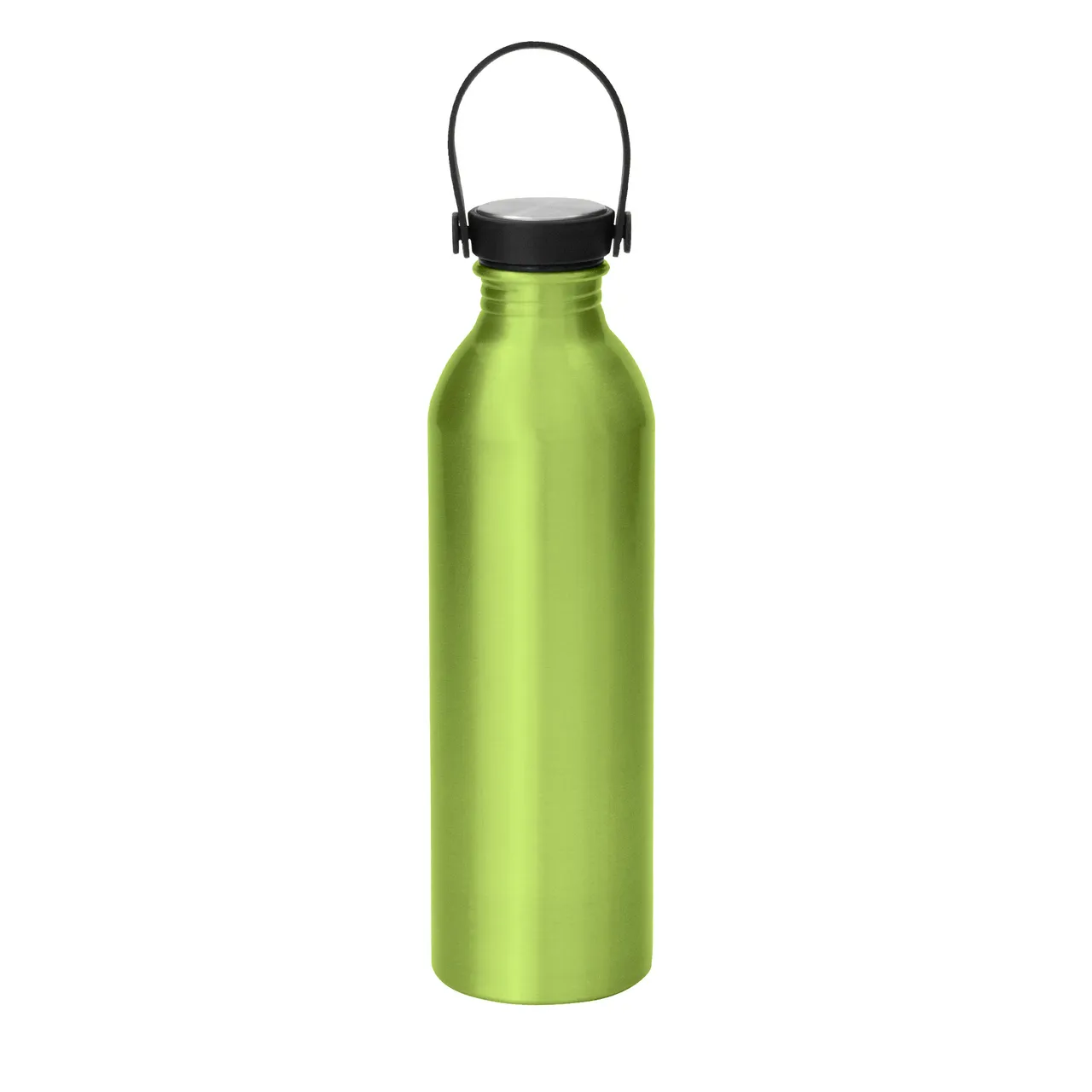 Hidratación a la mano.Botella de aluminio con acabado brillante. Tapa a rosca de acero inoxidable 201 y PP, con tira de silicona color negro.Medidas: Ø 6,5 x 23cm.
